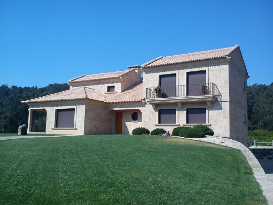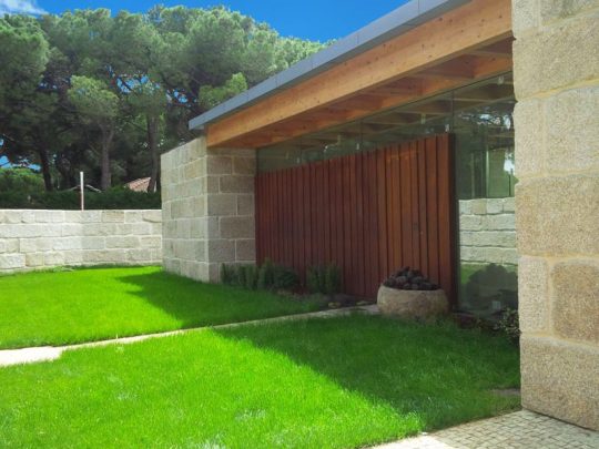 Construcción moderna en forma de “H”, se combinan dos tipos de piedra diferentes remarcando elementos verticales y puntuales rompiendo la uniformidad, los elementos en blanco terminan un conjunto que respeta su coherencia incluso con el cerramiento exterior.